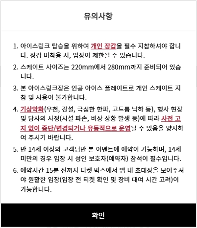 주의사항: 아이스링크 이용 중의 안전을 위해 반드시 제공되는 안전 장비를 착용해야 합니다. 특히, 스케이트를 처음 타는 초보자들은 보호대 착용을 권장합니다.