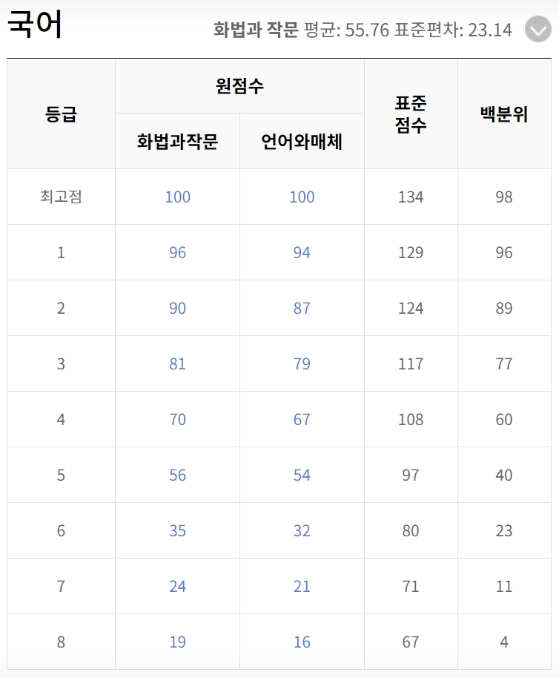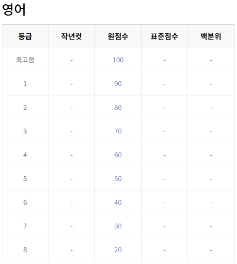 - 영어는 절대 평가 과목으로, 등급컷이 고정되어 있습니다. 90점 이상은 1등급, 80점 이상은 2등급으로 고정됩니다.